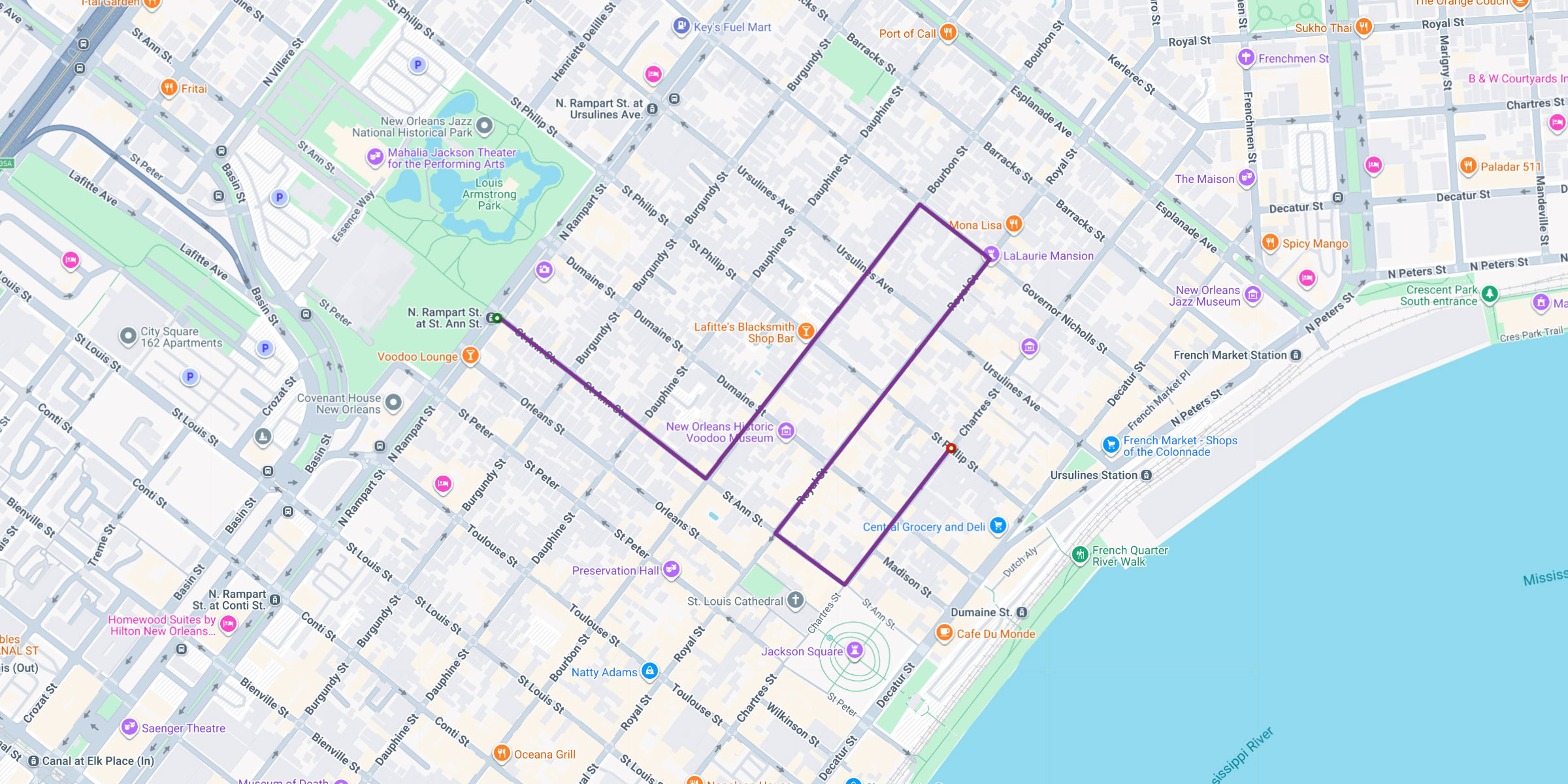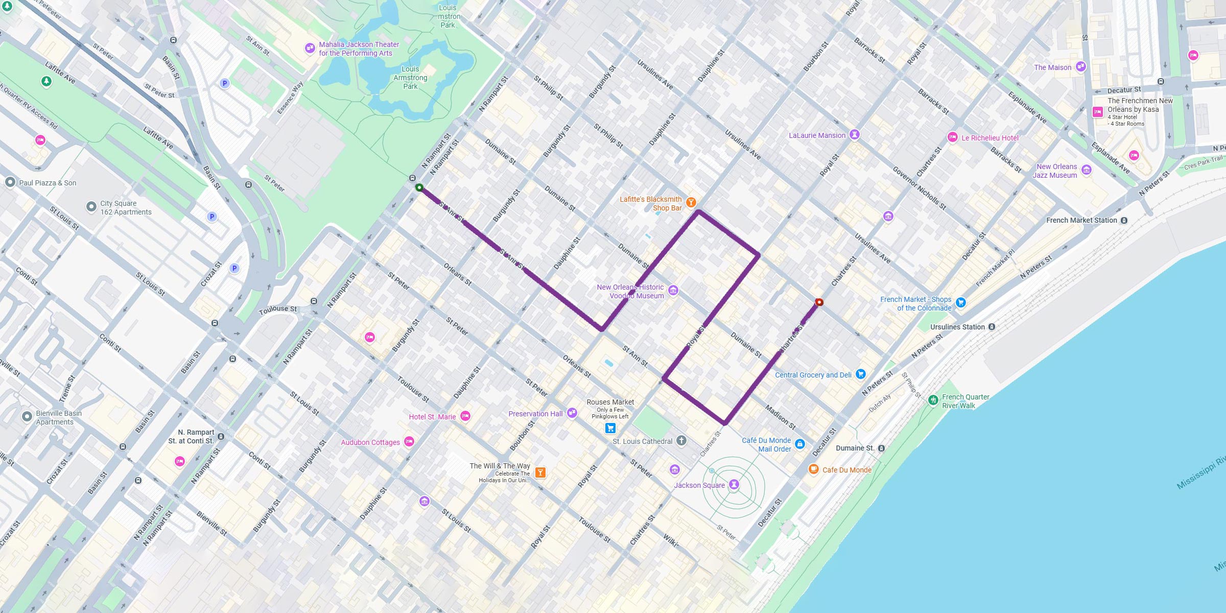 - Makes a left on St. Ann Street