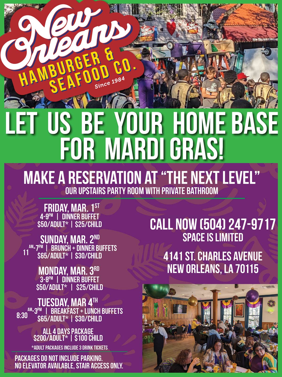 The best spot to watch the Uptown parades is beneath the shady live oaks at 4141 NOLA on St. Charles Avenue. Their Mardi Gras package includes wristband access to “The Next Level,” their festive upstairs party room with a full buffet, drink tickets for adults, and restroom usage. Downstairs, the connected restaurant,New Orleans Hamburger & Seafood Company, opens its doors out to the street.