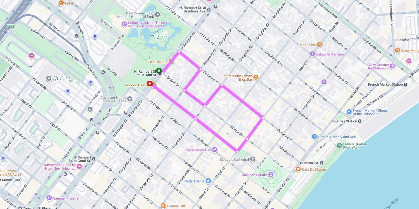 - Takes left on St. Ann to Dauphine