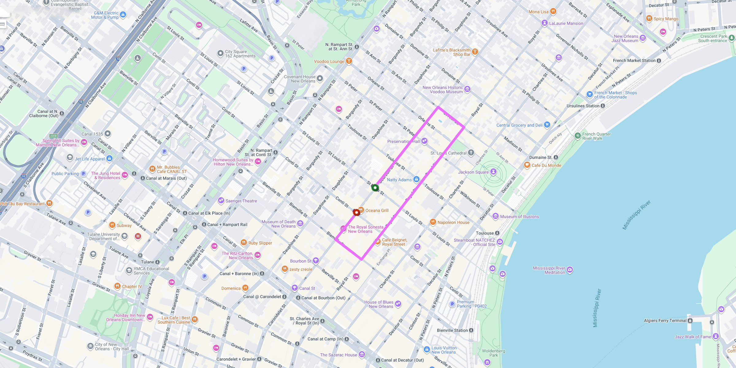 - Travels on Bourbon to St. Ann, then turns right